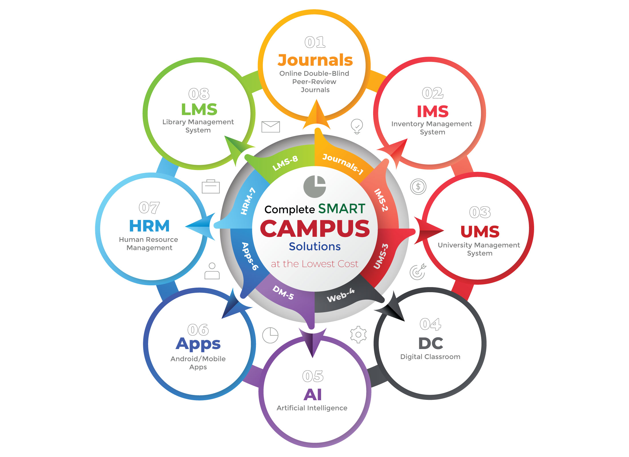 Our Smart Campus Solutions aim to create a more connected and responsive educational environment, fostering innovation, collaboration, and efficiency in both academic and administrative functions. These technologies contribute to an enhanced learning experience for students and a more sustainable and resource-efficient campus based on UMS, Digital Class Room, Library Management System, Inventory Management System, Human Resource Management System, Online Peer-Review Journals, Dynamic Website Development, Android Apps, Artificial Intelligence, Digital Marekting, Robust Cybersecurity and so on.